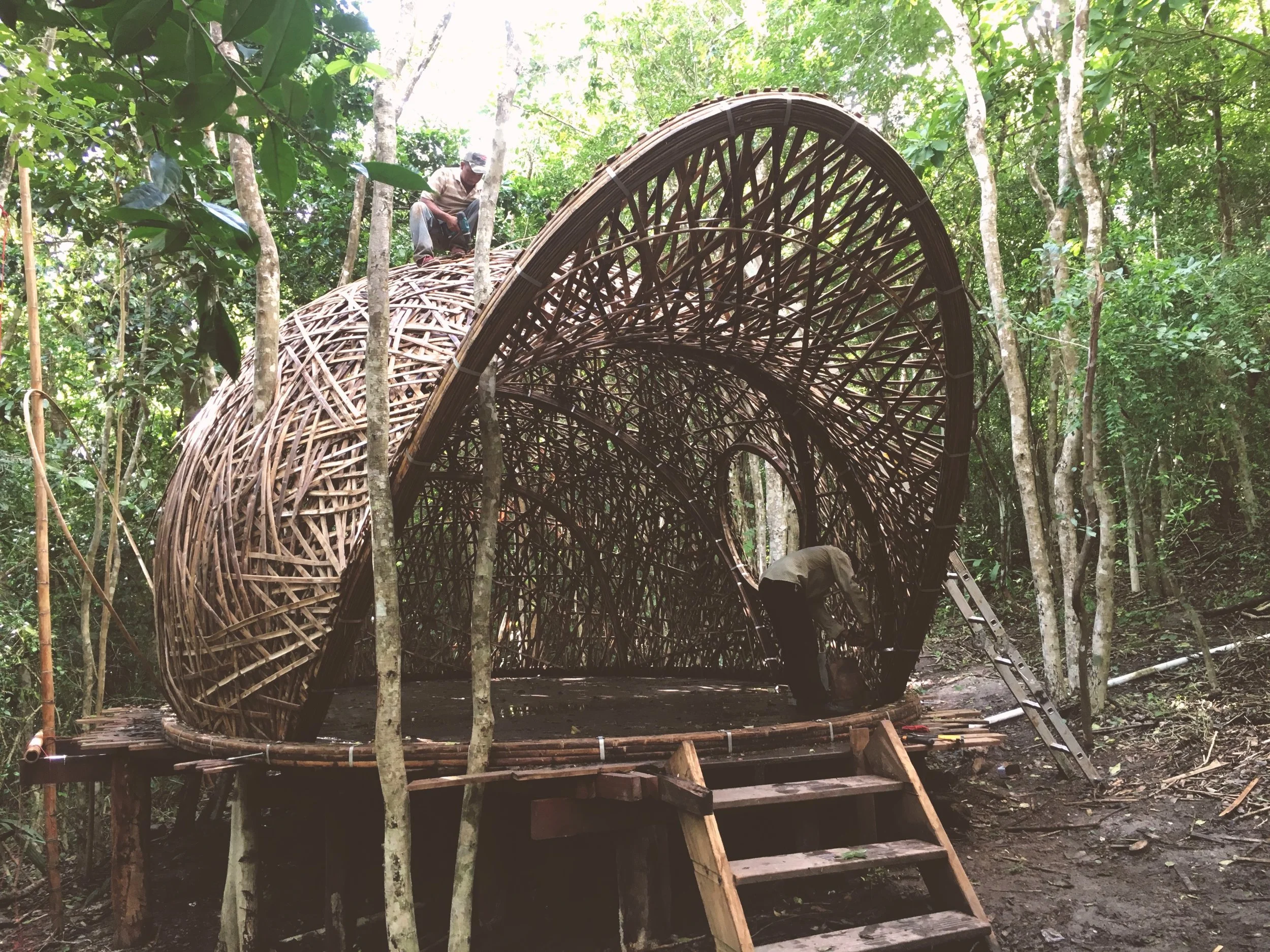An interesting cabin I helped build was this dome in Southeast Mexico. Around three thousand thin and playable sections of bamboo, cut from a larger shoot, were woven together in amongst the trees to form this strong rigid structure.